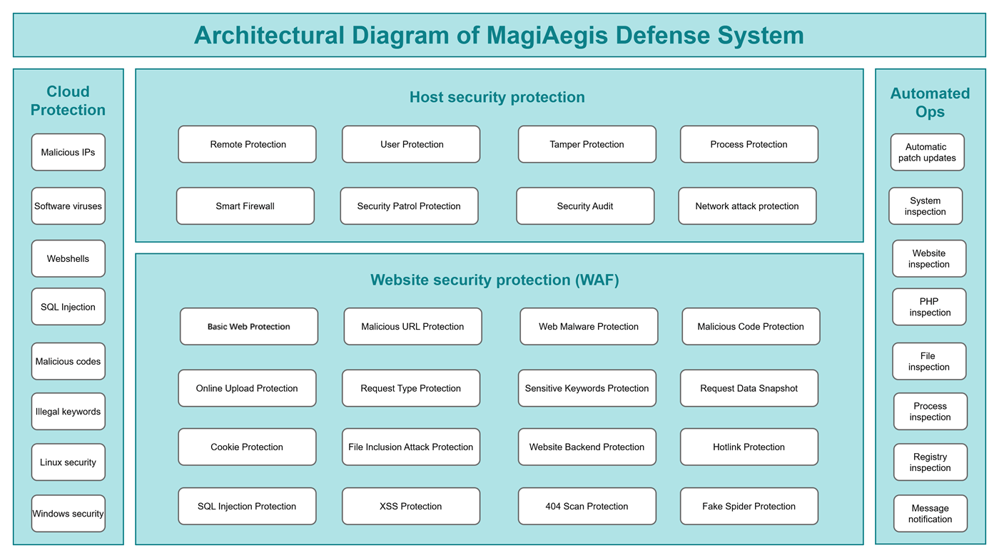 To this end, we need to utilize a new-generation protection software [MagiAegis - Defense System]. This system features a quadruple protection mechanism encompassing "Host Firewall + Web Application Firewall + Cloud Security Protection + Automated Ops" providing a one-stop solution to all security threats.